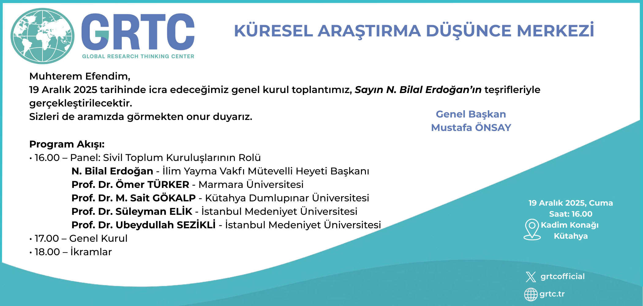 Global Research Thinking Center (GRTC) Olağan Genel Kurul Toplantısı, 19 Aralık 2025 Cuma günü Kütahya Kadim Konağı’nda gerçekleştirilecektir. Genel kurul toplantısı öncesinde, sivil toplumun günümüz dünyasındaki rolünü çok boyutlu biçimde ele alan bir panel düzenlenecektir.